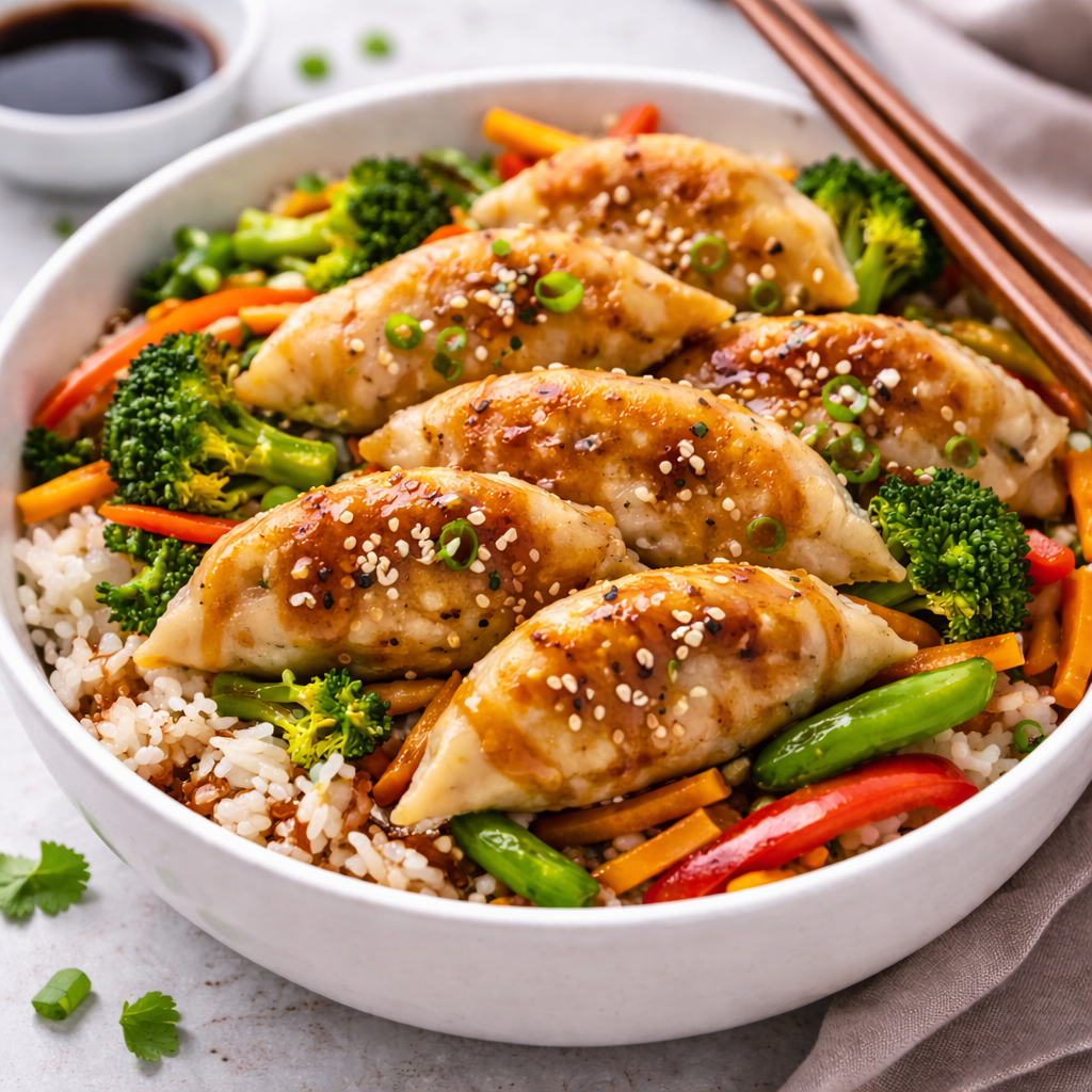 Warm chicken dumplings served with sautéed vegetables in a light soy sauce. A quick, comforting lunch ready in just 15 minutes.